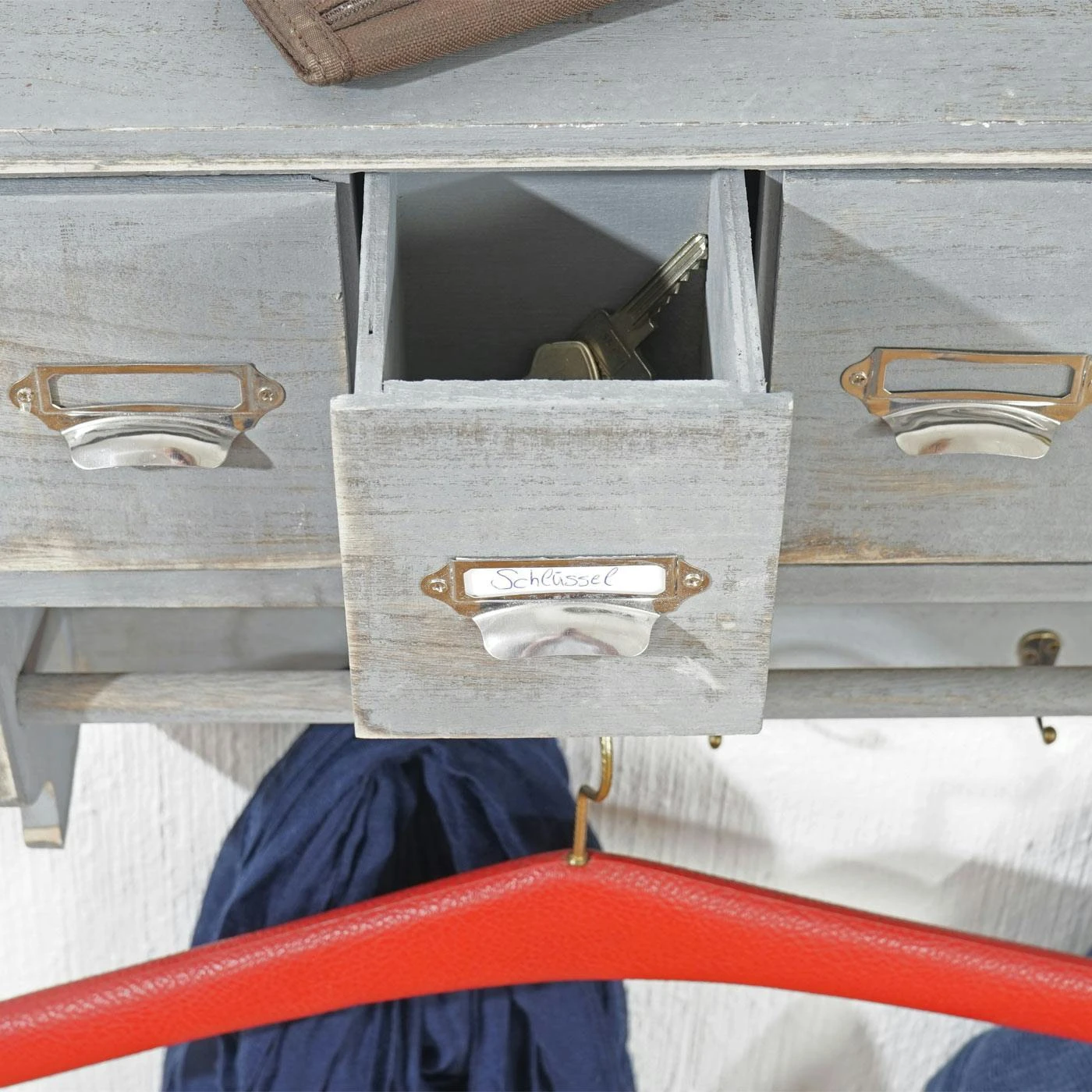 Sie wünschen von einer Wand mehr als nur Ihr Haus zusammen zu halten? Mit dieser Wandgarderobe können Sie jede Wand praktisch und dekorativ aufwerten! Durch den Shabby-Look wirkt jeder Flur, jede Diele oder auch das Schlafzimmer viel wohnlicher. Vier Haken und eine Kleiderstange machen es möglich, Ihre Kleidung schnell greifbar und übersichtlich platzsparend unterzubringen. Außerdem bietet diese Garderobe zusätzlich noch 5 Schubladen mit praktischen Einschüben für Einsteckschilder zur Aufbewahrung all Ihrer Kleinutensilien wie z. B. Schlüssel, Kleingeld und das Portemonnaie – da bleiben keine Wünsche offen.