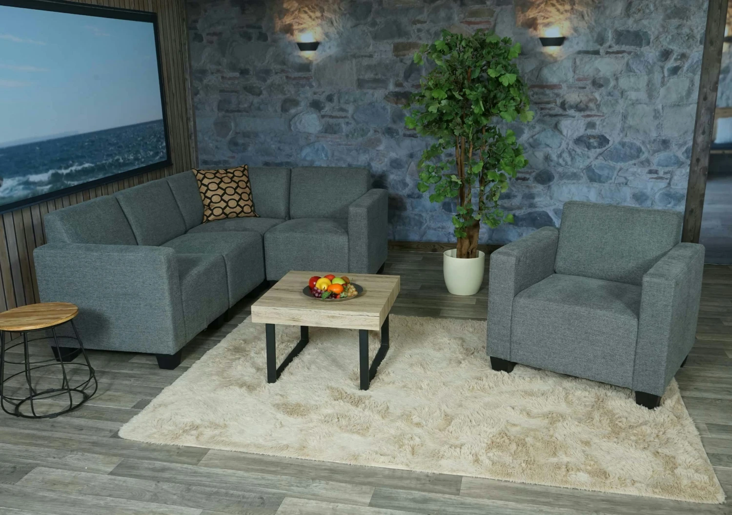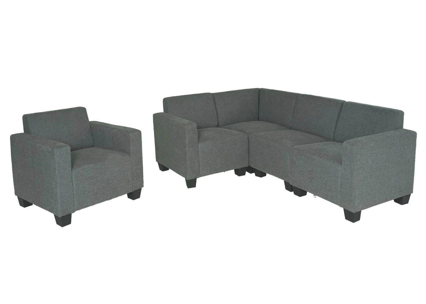 – Dieses moderne Sofa fügt sich durch das unaufdringliches Design nahtlos in jede Umgebung ein und sieht immer aus, als würde es genau dort hingehören. Dank der bequemen Polsterung lädt diese Couch zum Wohlfühlen ein und lässt keine Wünsche offen. – Der hochwertige Polsterbezug rundet das geschmackvolle Gesamtbild dieser eleganten Sitzgelegenheit ab und macht sie zu einem Must-have für alle, die gerne einmal entspannte Stunden verbringen oder sich das Warten verkürzen wollen. Maße (ca.): 4-Sitzer: Gesamthöhe: 76 cm Gesamttiefe: 142 cm Gesamtbreite: 214 cm Sitzhöhe: 43 cm Sitztiefe: 53 cm Sitzbreite: 216 cm Sessel: Gesamthöhe: 76 cm Gesamttiefe: 72 cm Gesamtbreite: 82 cm Sitzhöhe: 43 cm Sitztiefe: 53 cm Sitzbreite: 57 cm Sessel und 4-Sitzer: Breite der Armlehne: 12 cm Höhe der Armlehne (vom Sitz gemessen): 22 cm Höhe der Rückenlehne (vom Sitz gemessen): 37 cm Höhe der Füße: 11 cm Material: Bezug: Stoff/Textil (100% Polyester) Rahmen: Sperrholz aus Pappel und Massivholz aus Kiefer Fußstützen: Kunststoff Diese Couchgarnitur ist nicht nur optisch ansprechend, sondern überzeugt auch in Sachen Komfort und Stabilität. Gut verarbeitet, ist dieses Sofa-Set der ideale Anlaufpunkt für alle, die ein Plätzchen mit dem gewissen Etwas suchen. Die bequeme Sitzgelegenheit fügt sich nahtlos in jede Umgebung ein und setzt extravagante Akzente in Ihre heimischen vier Wänden.