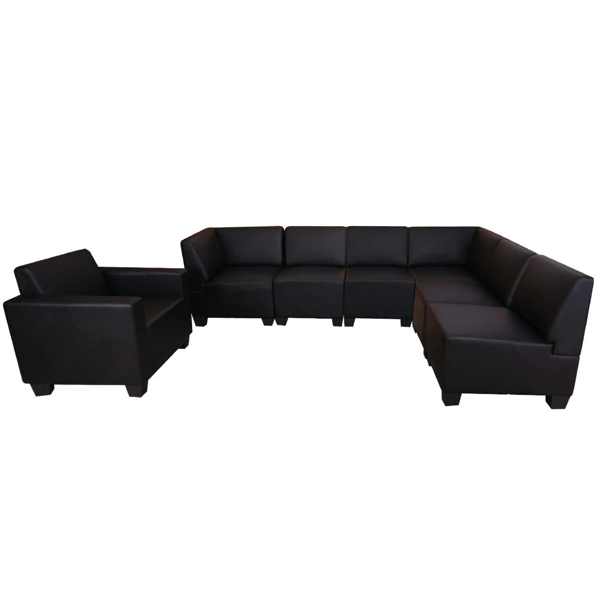 – Dieses moderne Sofa fügt sich durch das unaufdringliches Design nahtlos in jede Umgebung ein und sieht immer aus, als würde es genau dort hingehören. Dank der bequemen Polsterung lädt diese Couch zum Wohlfühlen ein und lässt keine Wünsche offen. – Der hochwertige Polsterbezug rundet das geschmackvolle Gesamtbild dieser eleganten Sitzgelegenheit ab und macht sie zu einem Must-have für alle, die gerne einmal entspannte Stunden verbringen oder sich das Warten verkürzen wollen. Maße (ca.): Gesamthöhe: 76 cm Gesamttiefe: 186 cm Gesamtbreite: 258 cm Sitzhöhe: 43 cm Sitztiefe: 53 cm Sitzbreite (inkl. Eckteil): 334 cm Breite der Armlehne: 10 cm (unten) bis 18 cm (oben) Höhe der Armlehne (vom Sitz gemessen): 37 cm Höhe der Rückenlehne (vom Sitz gemessen): 37 cm Höhe der Füße: 11 cm Maße Sessel (BxT) (ca.): Gesamt: 82×72 cm Sitzbreite: 57 cm Material: Bezug: Kunstleder (100% Polyurethan) Rahmen: Sperrholz aus Pappel und Massivholz aus Kiefer Fußstützen: Kunststoff Dieses Loungesofa ist nicht nur optisch ansprechend, sondern überzeugt auch in Sachen Komfort und Stabilität. Gut verarbeitet, ist dieses Sofa der ideale Anlaufpunkt für alle, die ein Plätzchen mit dem gewissen Etwas suchen. Die bequeme Sitzgelegenheit fügt sich nahtlos in jede Umgebung ein und setzt extravagante Akzente in Ihre heimischen vier Wänden. Verbunden werden die einzelnen Teile durch das praktische Clipsystem, so können Sie Ihre Garnitur ganz individuell an Ihr Platzangebot anpassen. Der Bezugsstoff aus Kunstleder besteht zu 100% aus Polyurethan (PU) – ein besonders hochwertiges und haltbares Material, welches für ein besonders weiches und angenehmes Hautgefühl sorgt. Im Gegensatz dazu wäre PVC als Kunstleder zwar deutlich preisgünstiger, weiß aber weder qualitativ, noch in Sachen Komfort zu überzeugen. Investieren Sie in Nachhaltigkeit – Sie werden es nicht bereuen.
