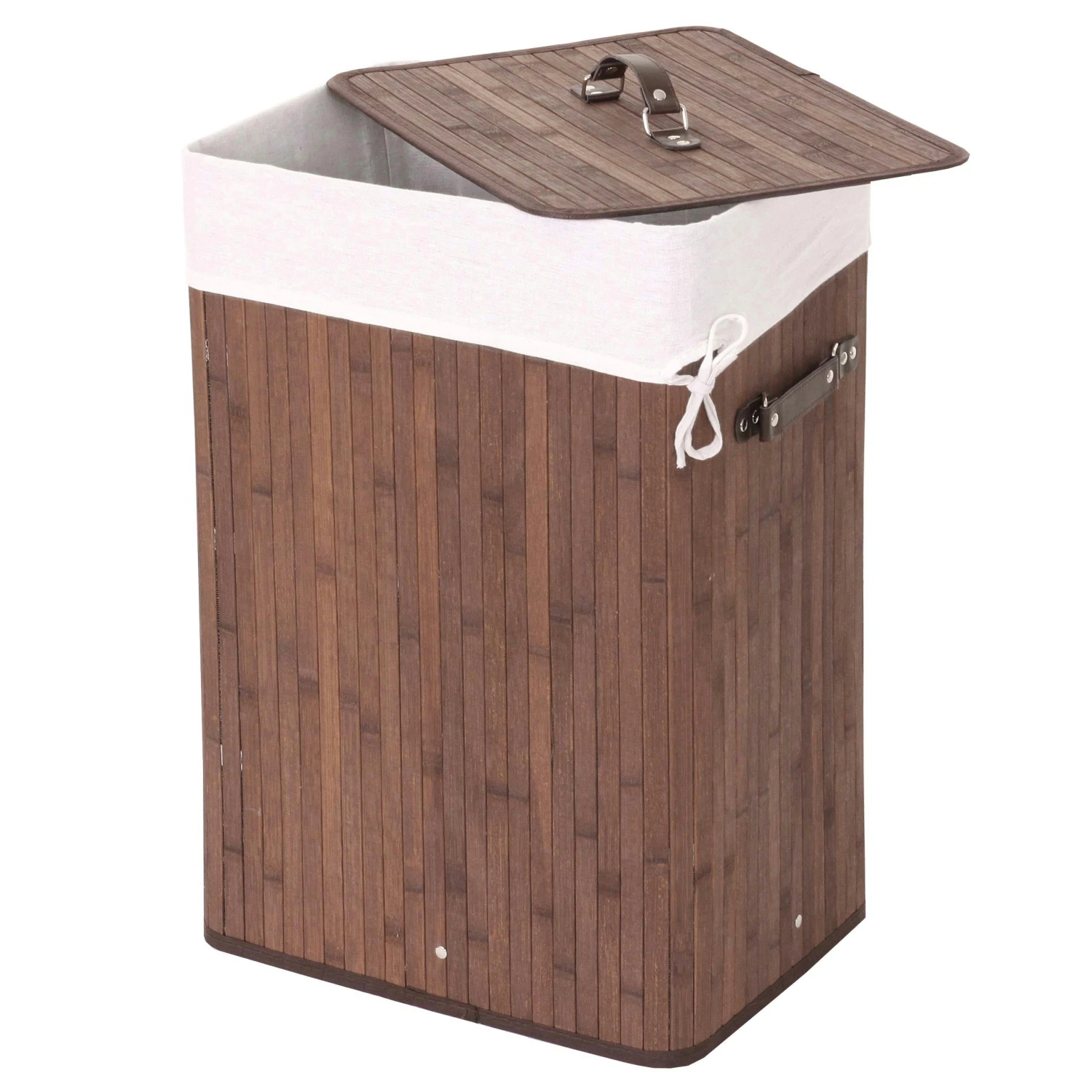 Dieser schicke Wäschekorb erfüllt drei Aufgaben in einem, er ist praktisch, dekorativ und dank der Fertigung aus Bambus auch noch ökologisch gut verträglich. Ausgestattet mit einem herausnehmbaren Bodeneinsatz und einem ebensolchen Metallrahmen hat der faltbare Korb einen stabilen Stand. Der zugehörige Wäschesack ist bequem am Korb zu befestigen und sorgt zusätzlich dafür, dass Ihnen kein Wäschestück verloren geht. Die beiden seitlichen Tragegriffe verhelfen zu einem leichten und problemlosen Transport. Wer nicht nur irgendeinen Wäschekorb möchte, sondern einen zugleich nützlichen und optisch ansprechenden Haushaltshelfer, hat hier genau das Richtige gefunden.